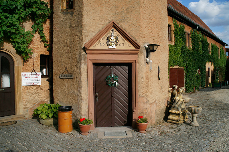 Der Turm im Schlosshof führt über den schlichten Renaissancewendelstein hinauf ins Dachgeschoss des Schlosses. Dort geht es zu einigen Hotelzimmern und in die ehemaligen Kemenaten, unserem Frühstücksraum. |