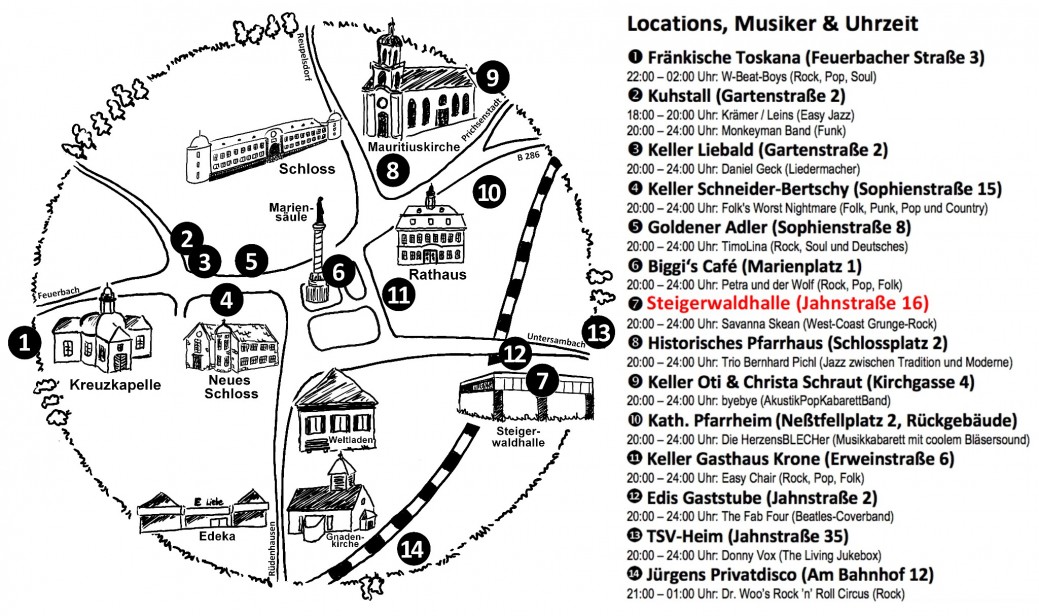 14 Veranstaltungsorte bieten eine tolle musikalische Vielfalt. Neben Pop- und Rockbands gibt es Jazz, Liedermacher, Bläsermusik, Beatles Coverband u.v.m , sowie Disotheken. Auch die Fränkische Toskana ist mit dabei. Ein Shuttelbus fährt die Gäste zu den verschiednen Orten.