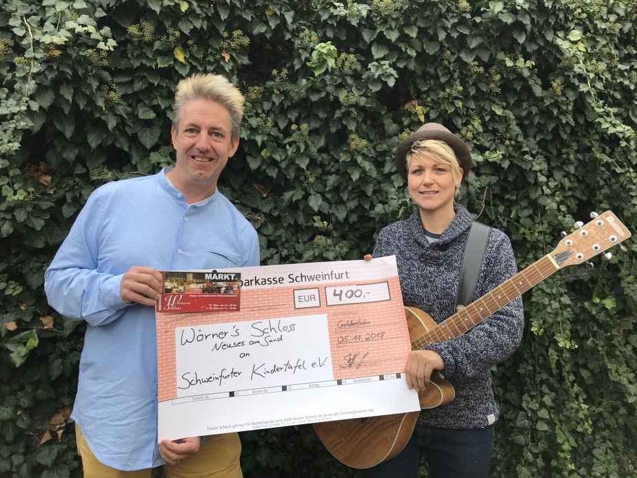 "Unser Markt lebt von der Kulisse im Schlosshof und den Innenräumen. Ca. ein Drittel aller Stände ist im Festsaal Tenne, in der Weinhalle und im ganzjährig geöffneten Schlossladen mit Galerie. Diese ca. 200 qm mit Kunst von zahlreichen Handwerkern, Delikatessen und weihnachtlichen Accessoires werden auch zur Adventszeit geöffnet sein - insofern es die Coronaauflagen erlauben. Gerne schenken wir dann auch unseren beliebten Glühwein im Schlosshof aus. Jedoch ein großer Markt mit tausenden Besuchern, Musik und Aussellern, das lässt die aktuelle Coronalage leider nicht zu." Viele der Marktaussteller haben bereits im Frühjahr 2020 ihre Standgebühr bezahlt. Diese wurden für dieses Jahr gutgeschrieben und jetzt entweder zurückerstattet oder als Spende verwendet. Insbesondere möchten wir uns bei den folgenden Ausstellern bedanken. Sie haben alle Ihr Standgeld für einen guten Zweck gesponsert: Familie Wörner hat diese Gelder verdoppelt und kann somit jedem der sozialen Projekte eine Spende in Höhe von 334 Euro übergeben.