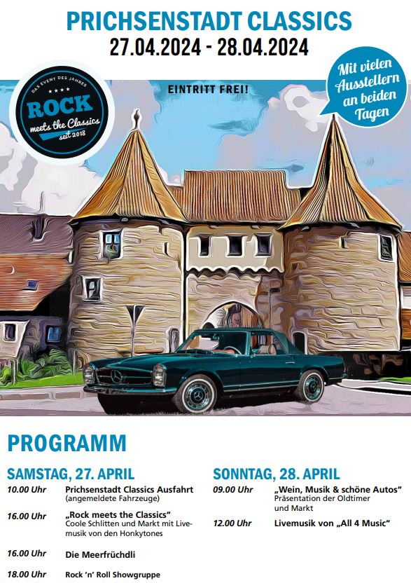 Der traditionelle Oldtimermarkt findet in der schönen Kulisse der Altstadt statt. Schwingen Sie doch mal Ihr Tanzbein bei flotter Musik oder lauschen Sie gemütlich den Klängen mit einem Prichsenstädter Wein in der Hand.